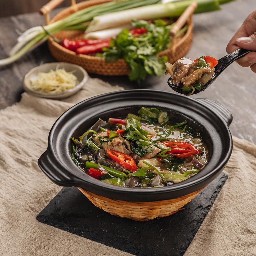 Claypot Turtle Soup Large (4pax) - 1 x Large Claypot Turtle Soup, 1 x Cucumber in Vinaigrette, 1 x Aged Preserved Raddish Omelette, 1 x Jade Tofu, 1 x Handmade Prawn Roll, 4 x Drinks, 4 x Rice